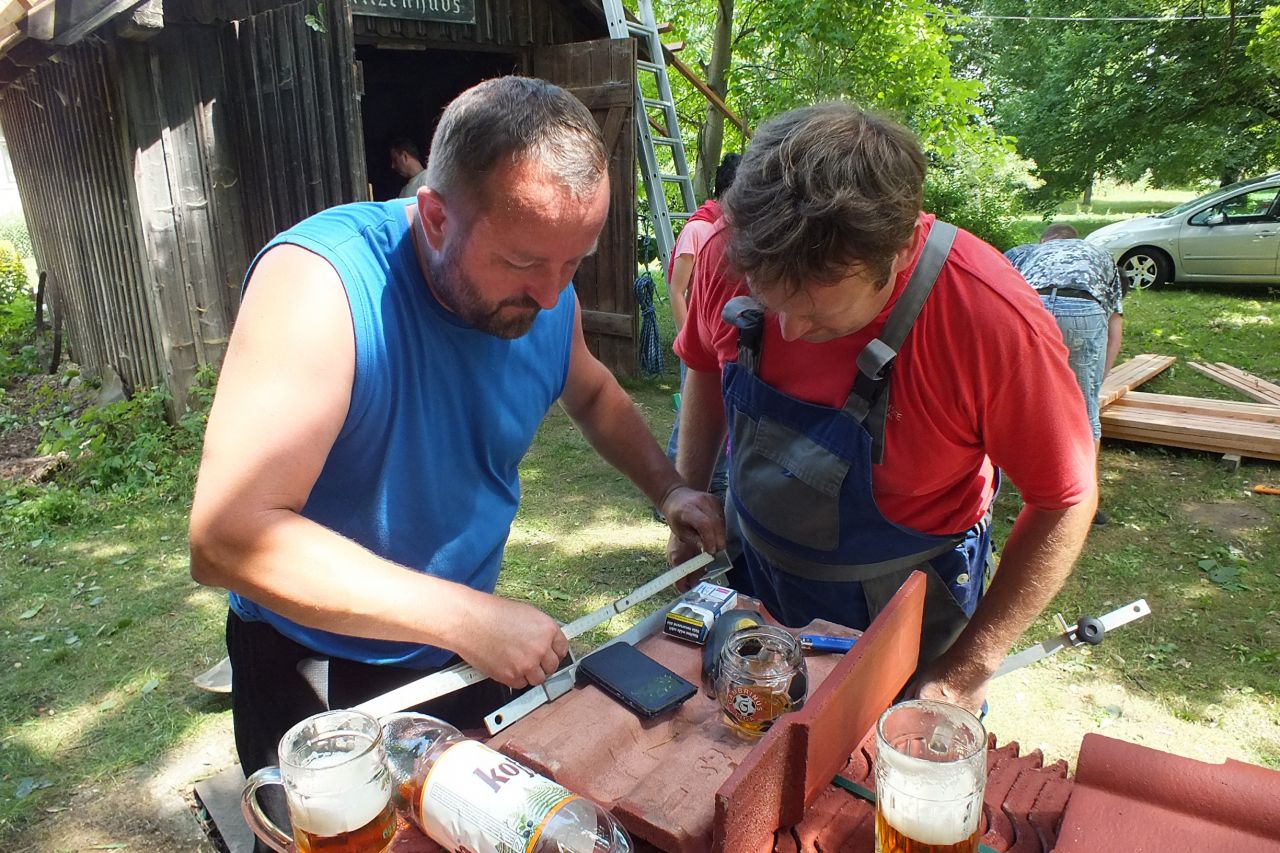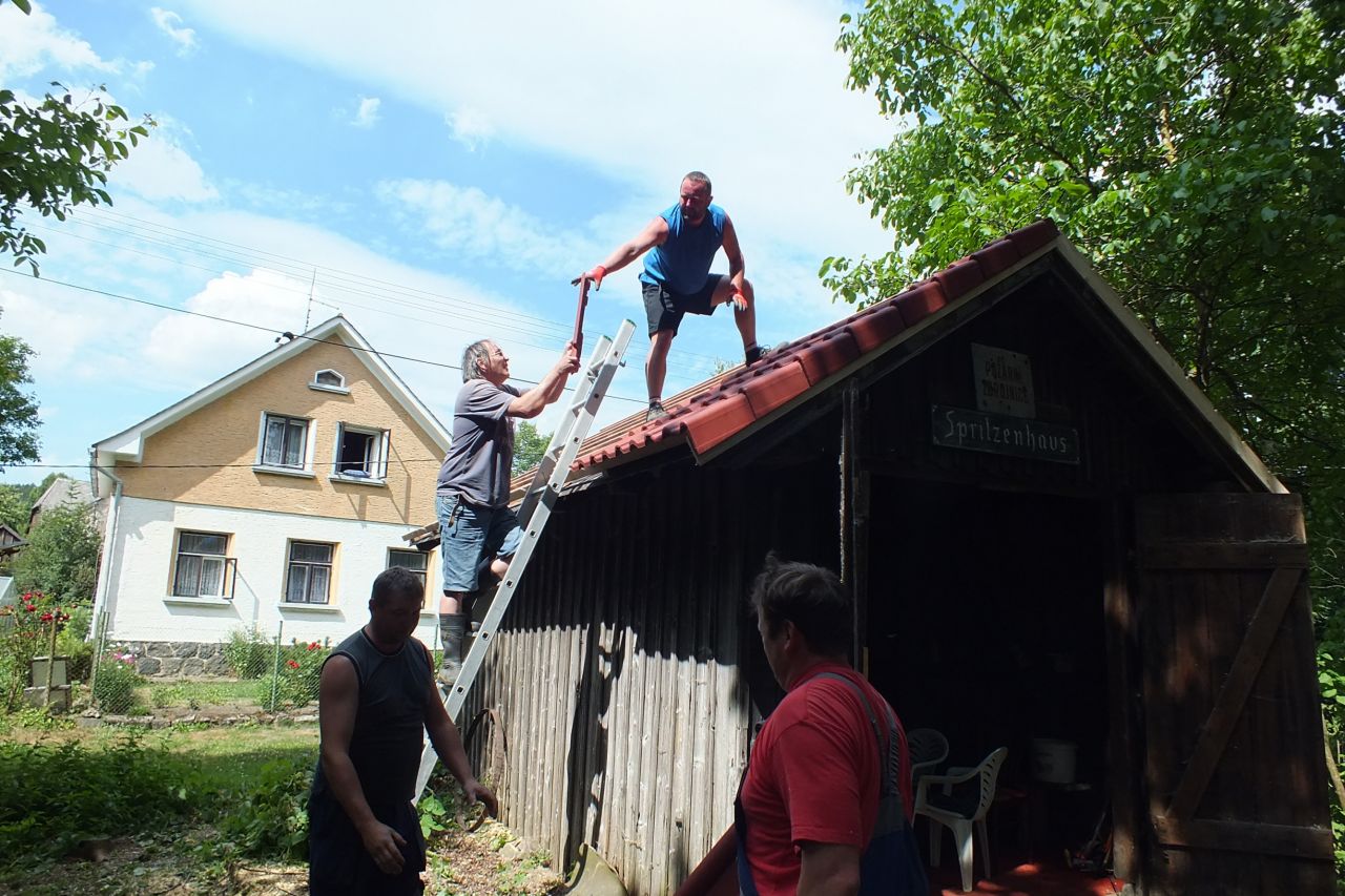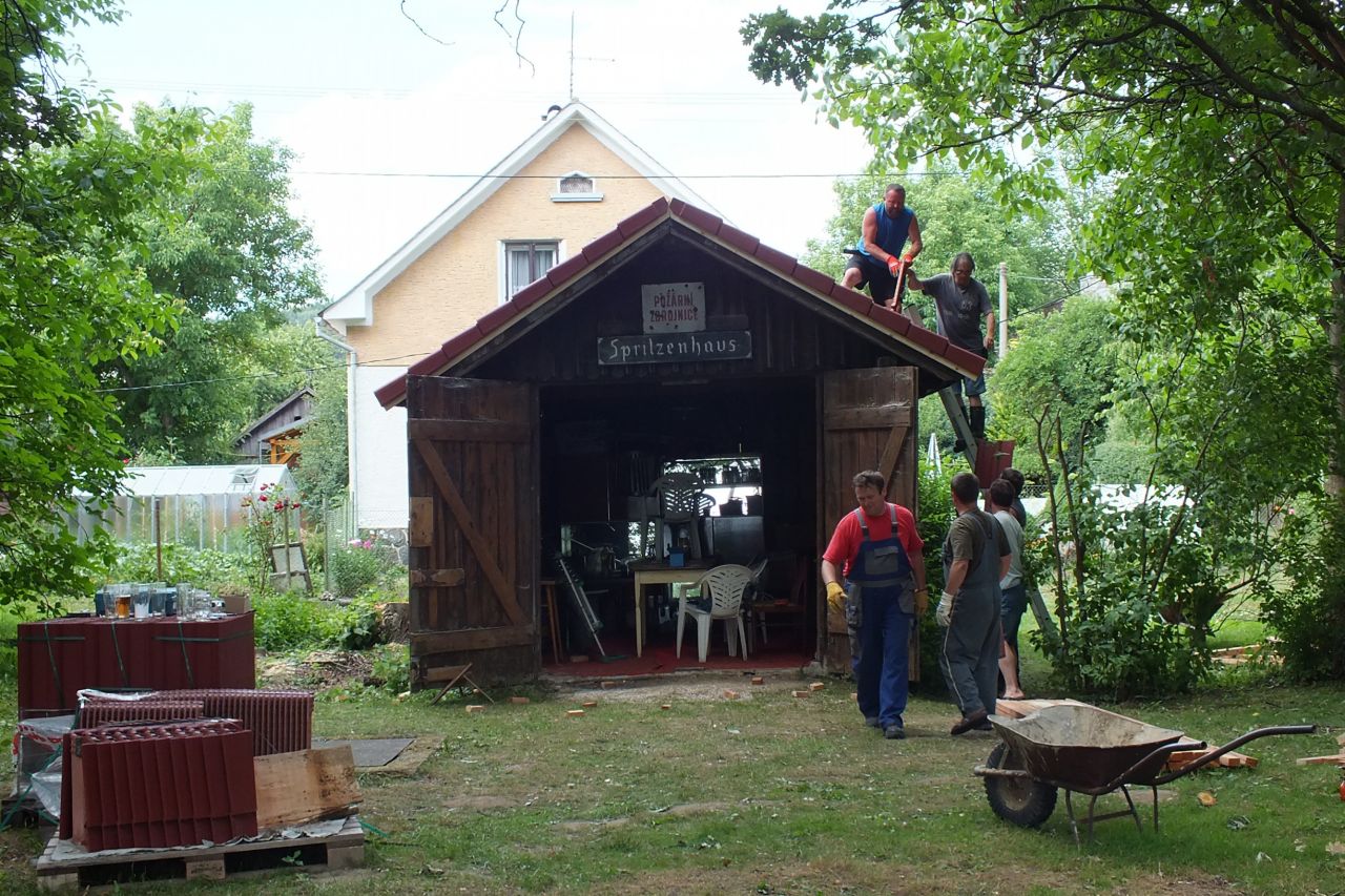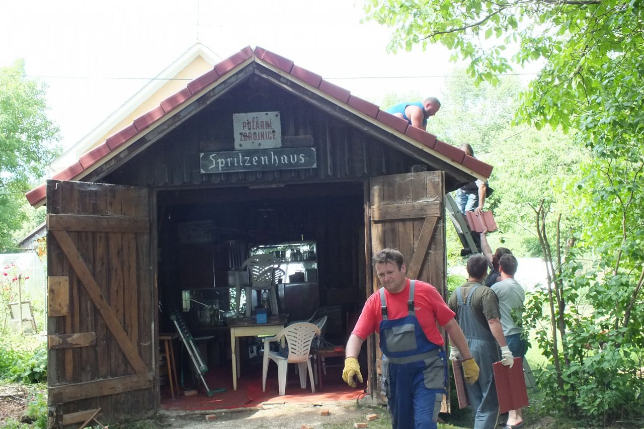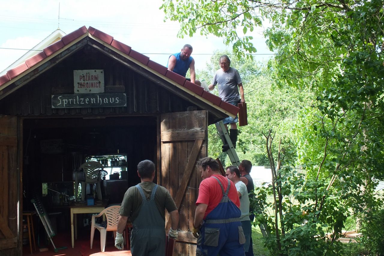 V sobotu 4.7. za podpory místních obyvatel a obecního úřadu v Mutěníně, byla provedena výměna střešní krytiny na bývalé hasičské zbrojnici ve Starém Kramolíně. Na hřeben střechy byl umístěn pozlacený kohout, dar p. Jodase (děkujeme), který od nynějška bývalou zbrojničku střeží. Střecha byla dokončena za jediný den. V podvečerních hodinách se celá vesnice sešla a v doprovodu dobré muziky se oslavilo zdařilé dílo. Překvapením pro všechny přítomné, bylo předání sklenic na pivo od rodiny Prenerů s nápisem " Starý Kramolín, číslo domu a Spritzenhaus (hasičská zbrojnice).