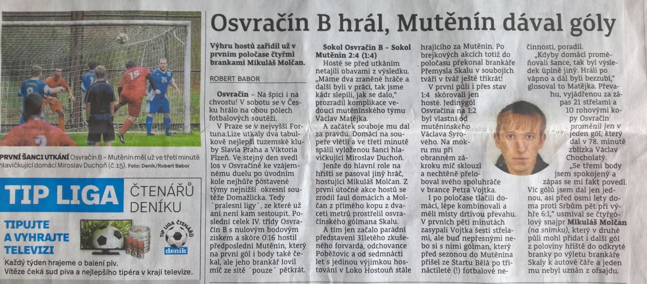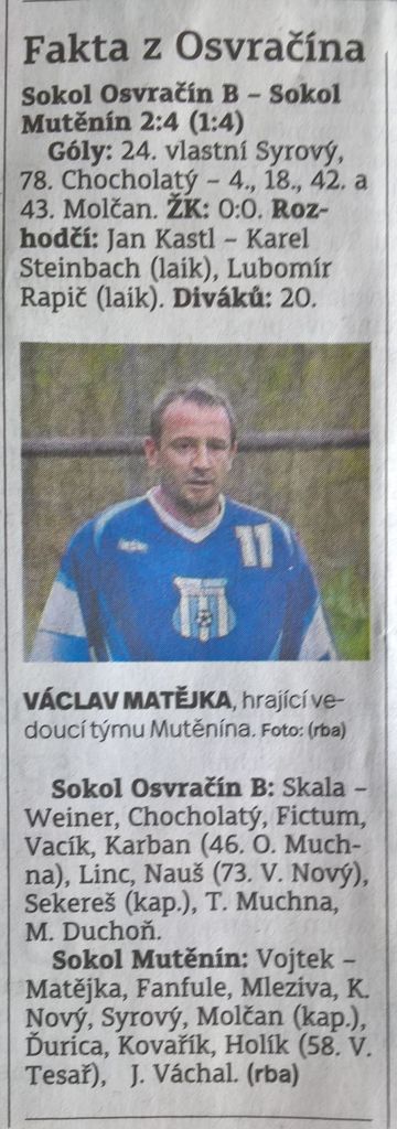 TJ Sokol Mutěnín sehrál v Osvračíně po dlouhé době vítězný zápas. Domácí hráči měli celé utkání převahu, ale tak jak to bývá, góly dává soupeř. Mutěnínský kanonýr Mikuláš Molčan nastřílel Osvračínu čtyři góly a jelo se domů. Celý zápas podrobně sledoval reportér z Domažlického deníku pan Robert Babor a věnoval v pondělí 3.9.2018 půlku stránky Domažlického deníku TJ Sokolu Mutěnín. Gratulujeme a jen tak dál.