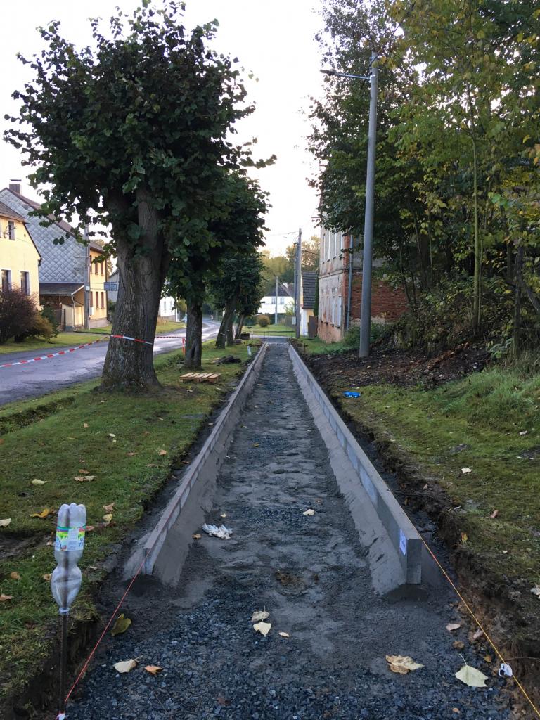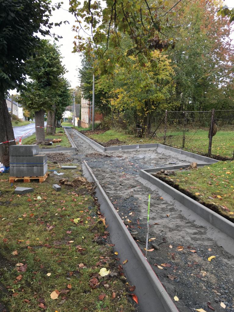 Po čtrnácti dnech od zahájení práce na výstavbě chodníku ve spodní části návsi je vidět velký pokrok.