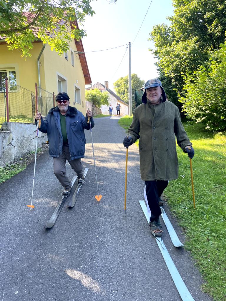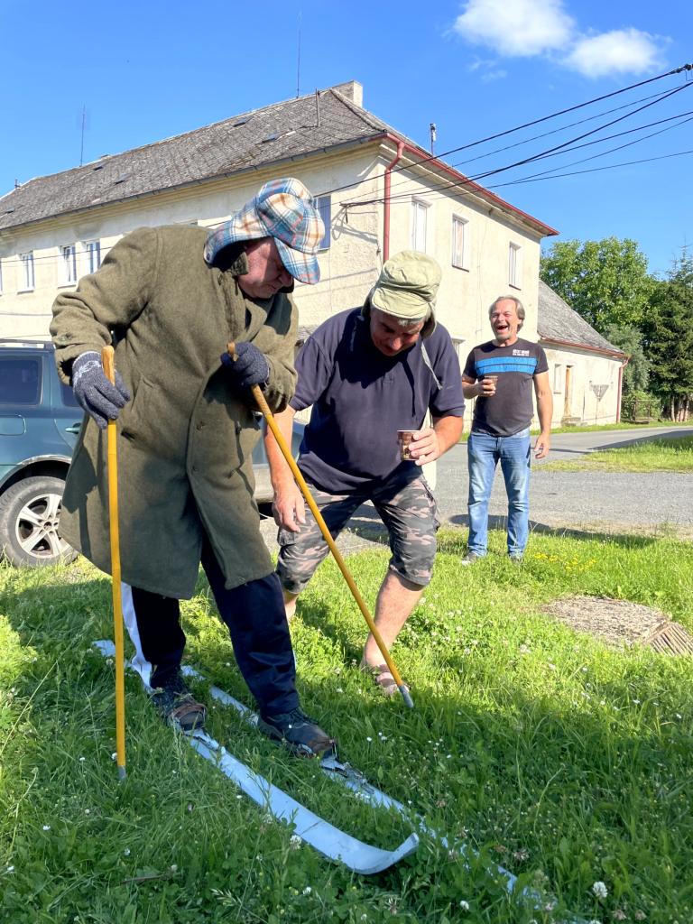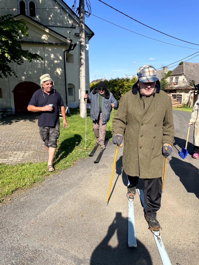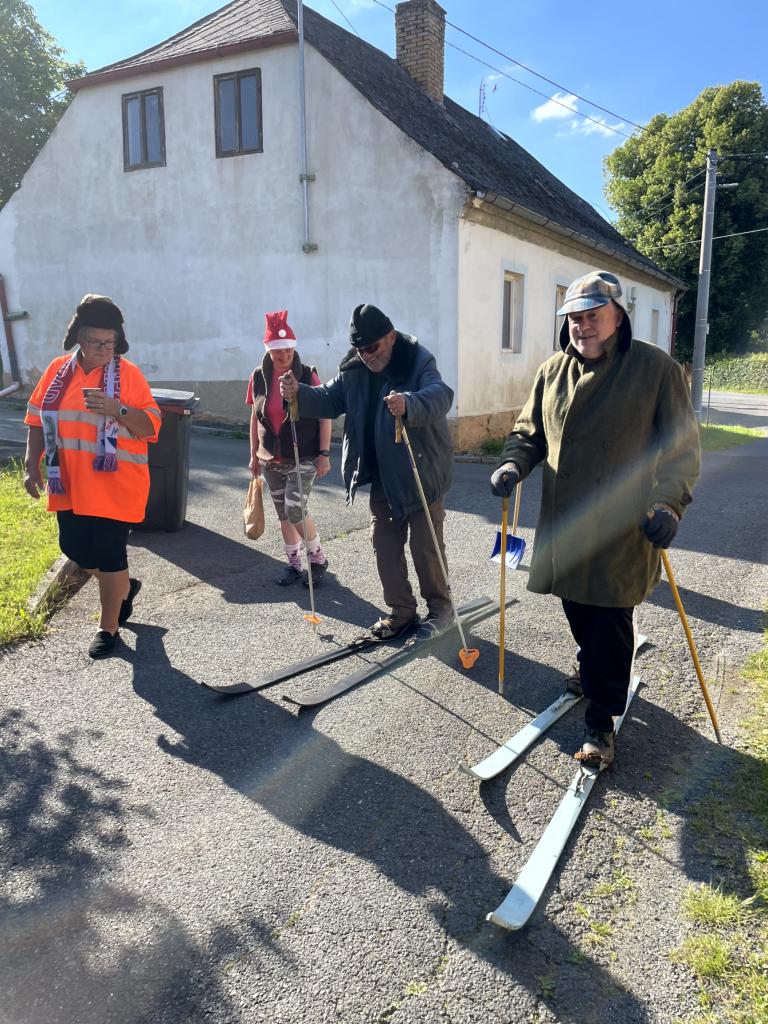 Na letošní jízdu po obci se počasí vydařilo. Bylo jasno a teploměr ukazoval +32 stupňů ve stínu. Na startu bylo vše perfektně připraveno. Hrály koledy a podával se svařák pro přehřátí a jen ty nejotrlejší se pořádně zachumlali do zimního oblečení. Letos to byli jen dva lyžaři, (poznámka - zbytek lyžařů byl nachlazen) kteří dokázali vzdorovat nepřízni počasí a statečně projeli celou trasu. Ostatní účastníci byl technický dozor, zdravotník, nebo servismani s náhradníma lyžemi.