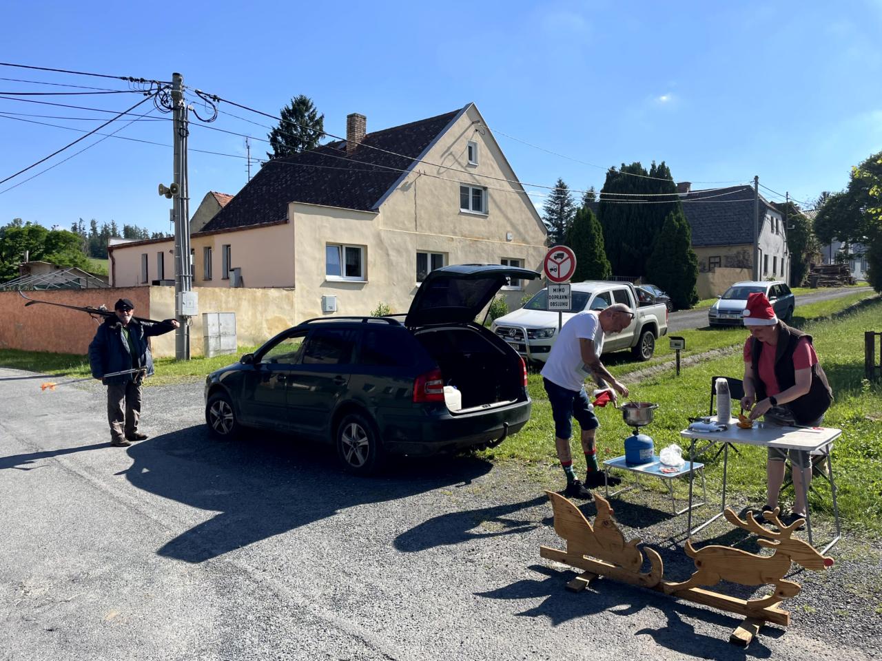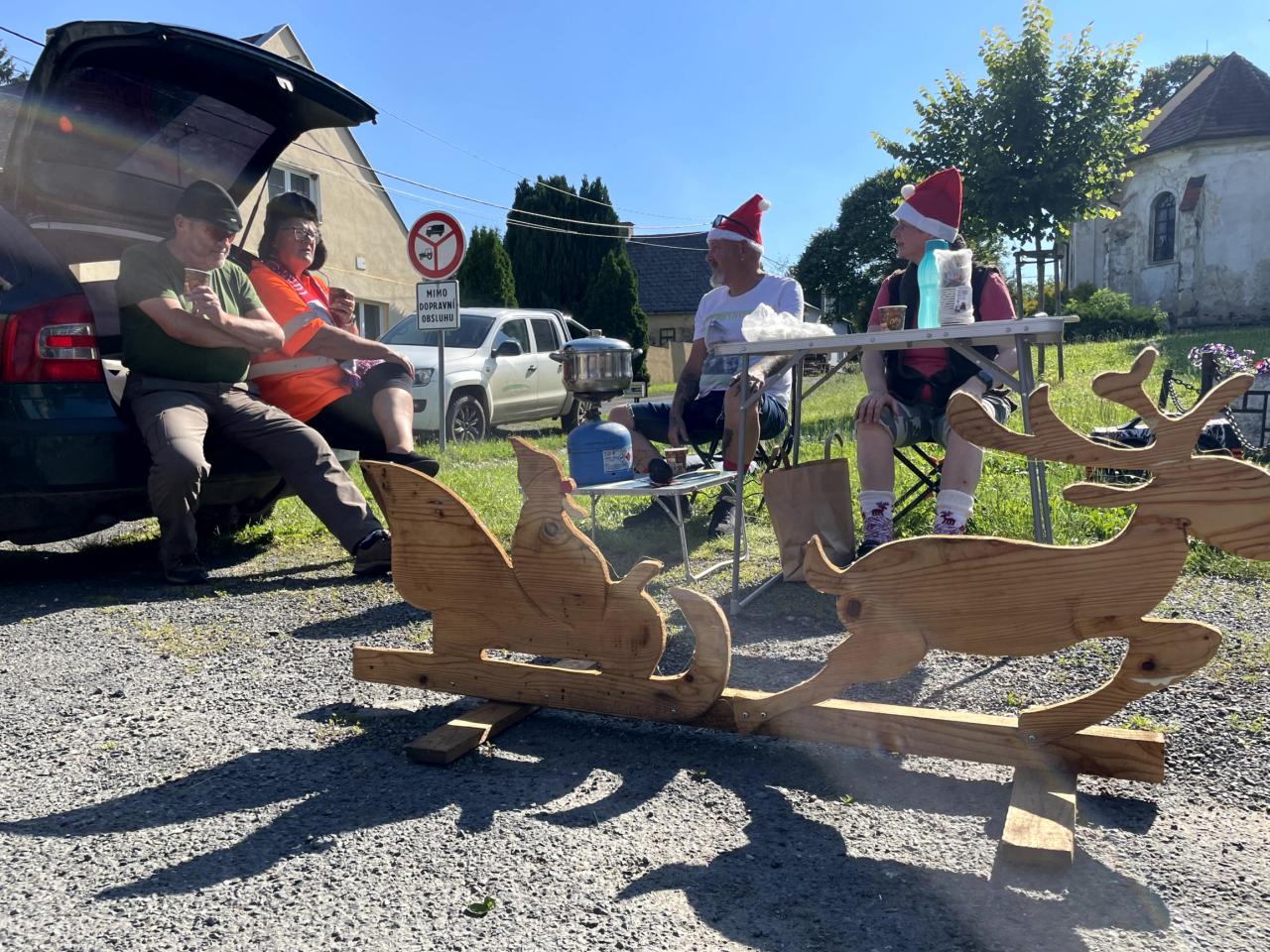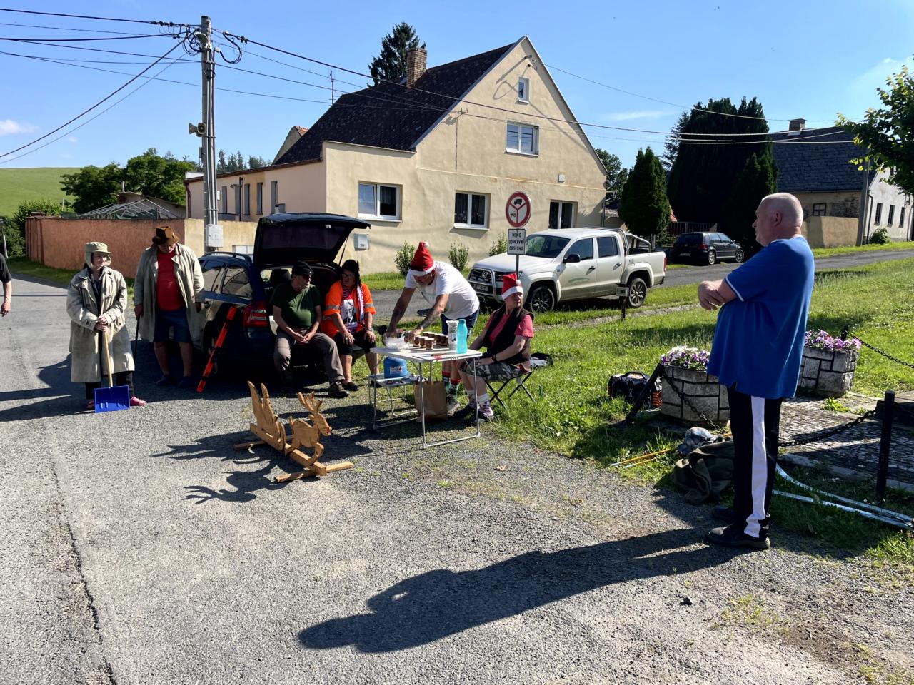 Na letošní jízdu po obci se počasí vydařilo. Bylo jasno a teploměr ukazoval +32 stupňů ve stínu. Na startu bylo vše perfektně připraveno. Hrály koledy a podával se svařák pro přehřátí a jen ty nejotrlejší se pořádně zachumlali do zimního oblečení. Letos to byli jen dva lyžaři, (poznámka - zbytek lyžařů byl nachlazen) kteří dokázali vzdorovat nepřízni počasí a statečně projeli celou trasu. Ostatní účastníci byl technický dozor, zdravotník, nebo servismani s náhradníma lyžemi.