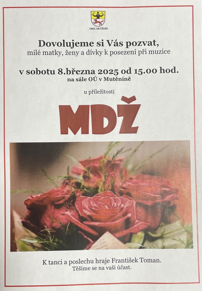 Obec Mutěnín zve všechny ženy a dívky k posezení při muzice u příležitosti MDŽ. Čekáme Vás v sobotu 8.3. 2025 od 15.00 hod. na sále OÚ v Mutěníně.