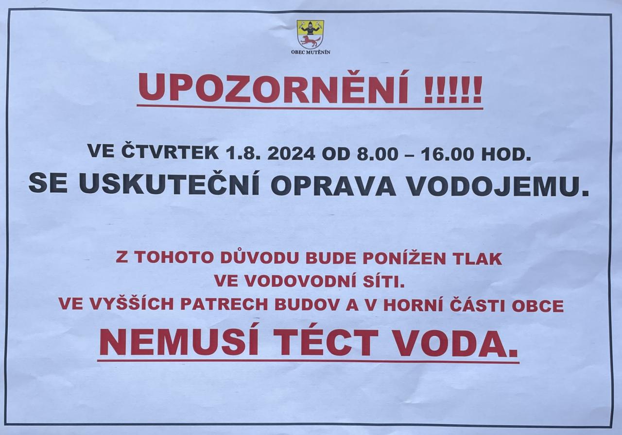 Upozornění - oprava vodojemu 1.8. 2024 od 8.00-16.00 hod.