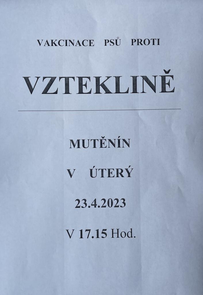 V úterý 23.4. 2023 od 17.15 hod. proběhne vakcinace psů proti vzteklině. Mutěnín - náves, u autobusové zastávky.