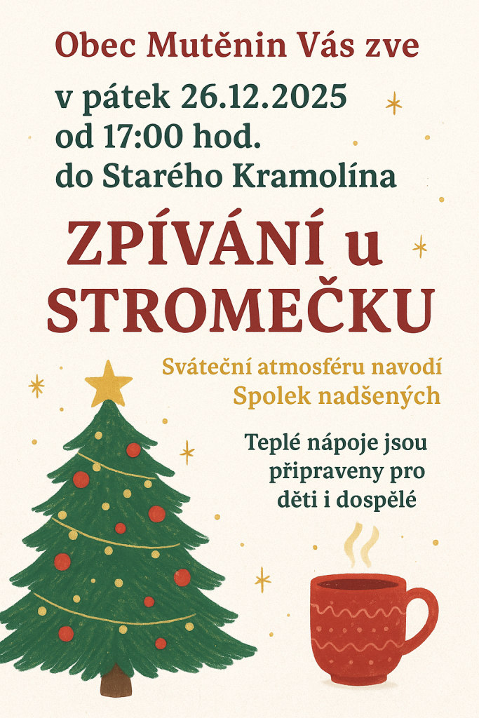 Obec Mutěnin srdečně zve všechny zájemce na akci Zpívání u stromečku, která se koná v pátek 26. prosince 2025 od 17:00 hodin ve Starém Kramolíně na návsi. Přijďte si užít sváteční atmosféru s hudebním vystoupením Spolku nadšených. Pro účastníky budou připraveny teplé nápoje, které potěší jak děti, tak dospělé. Nezapomeňte si s sebou vzít dobrou náladu a těšit se na společně strávený čas.